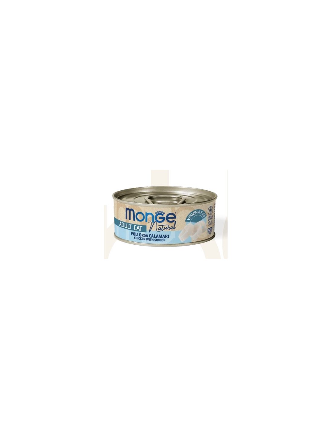 Pollo 60%, Tonno a pinne gialle (Thunnus Albacares) 10%, Calamari (Loligo spp) 5%, riso, F.O.S. (Frutto-oligosaccaridi).